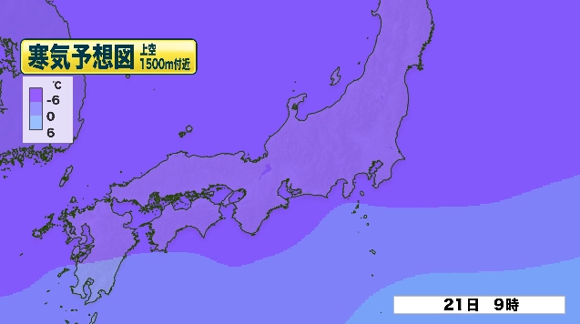 1月21日は東海地方の上空 約1500メートルに氷点下9℃以下の強い寒気が流れ込む見通しで、静岡県では気圧の谷の影響で、東部地区の山地を中心に21日未明から夕方にかけて雪が降り、積雪となるところがありそうです。