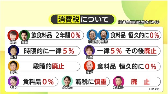 2025年の参院選などで国民民主党は「一律5%」を、その他の政党も廃止や削減などを掲げ減税に慎重な国政政党は「チームみらい」だけです。