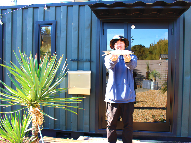 カフェに隣接するカーキ色のコンテナが釣り具専門店です。