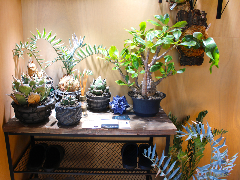 巧さんが自分で施工したこだわりの空間です。店内に置かれたアガベの仲間やサボテンが出迎えてくれます。