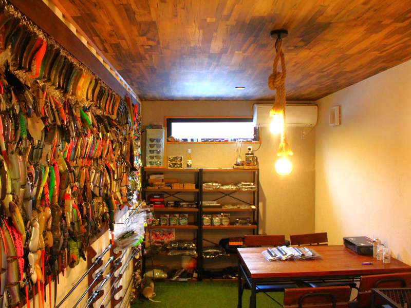 店内の奥に足を進めると商談ができるスペースがあり、壁一面に数えきれないほどのルアーが飾ってありました。