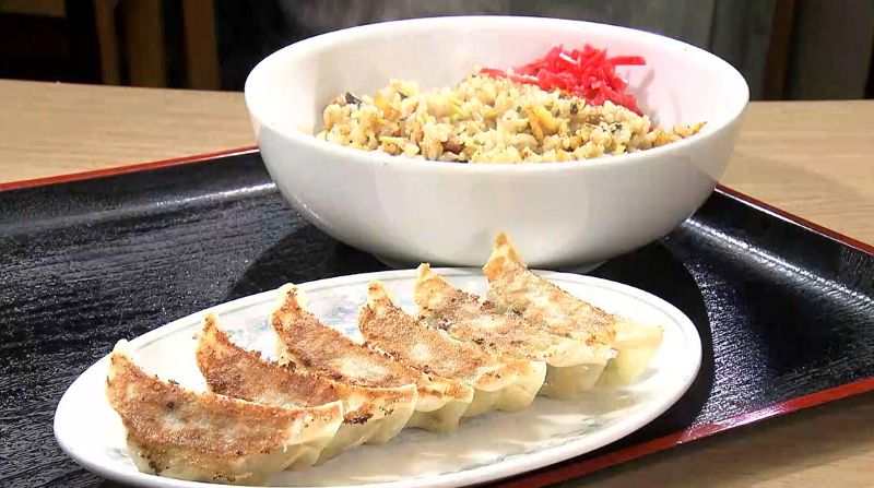 チャーハンのポイントは細かく刻まれた高菜です。ギョーザは小ぶりながら三島の地場野菜がぎっしりと入っています。