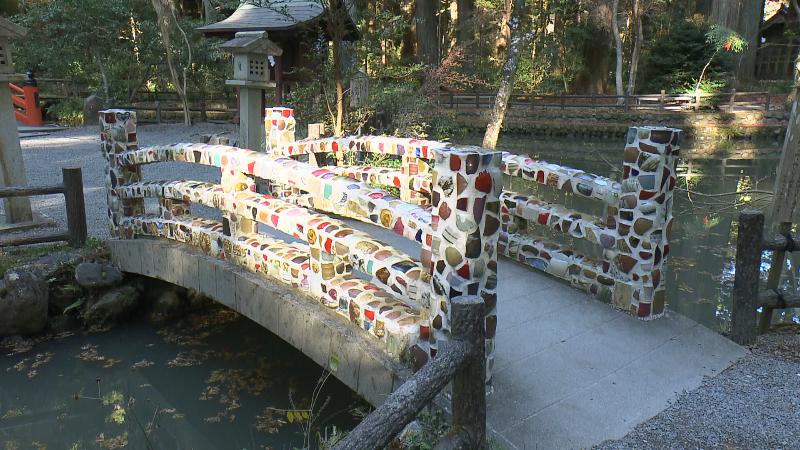池にかかるカラフルな橋は「森山焼の橋」です。森町の陶房に協力をお願いし、それぞれの特色のある陶器片を埋め込んでいます。