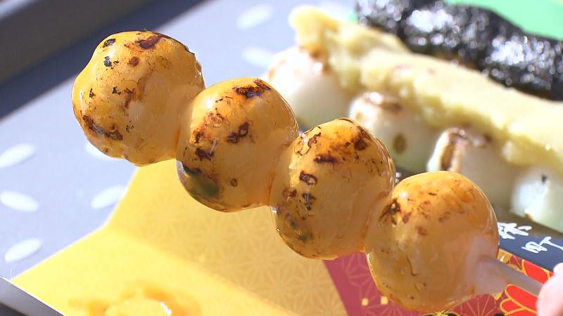 ほんのり甘い「黒ごま」に、サツマイモを皮ごとすりつぶしたあんを使った「皮つきおさつ」。どちらも焼きたてで提供してくれるので、温かい団子を楽しむことができます。
