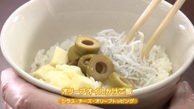 最後は、なんとホカホカのご飯にオリーブオイルをかけて、チーズ、オリーブ、シラスをトッピング。ご飯とよく混ぜて食べてみます。