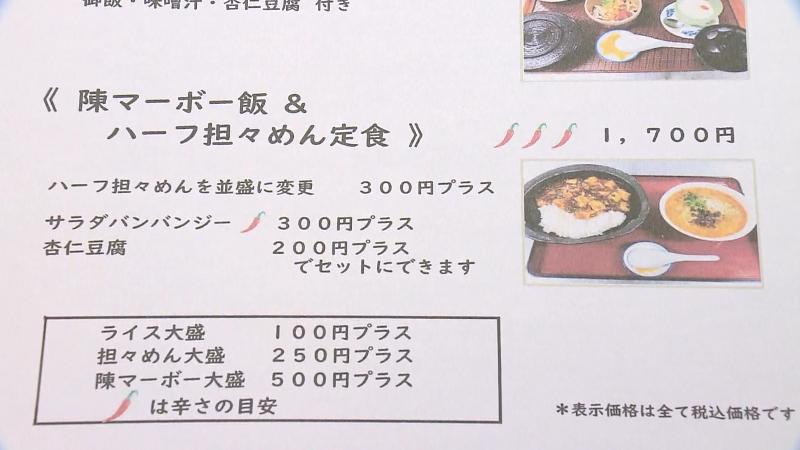 その2つのメニューがどちらも楽しめるセットがあるということで「陳マーボー飯&ハーフ坦々めん定食(1700円)」を注文しました。