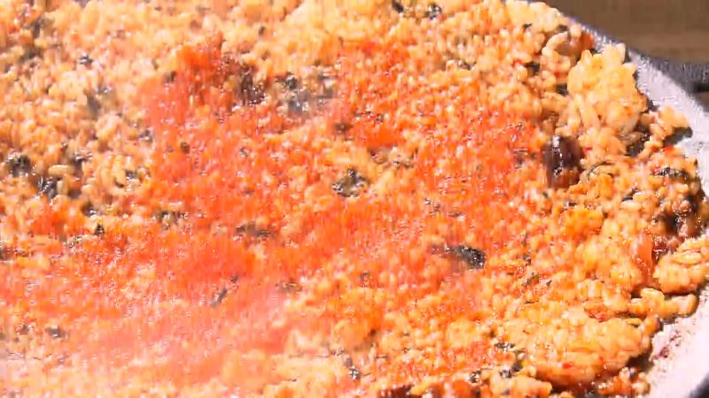 鍋の上で豪快にご飯を混ぜ、最後にたっぷりの“とびこ”を乗せて完成です。
