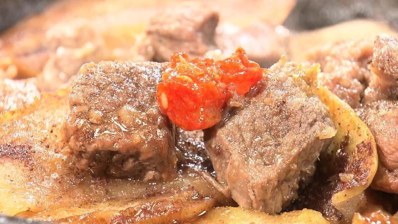 さっそく、リンゴと牛肉を一緒に食べてみます。とてもおいしいのですが、今まで食べたことのない不思議な味わいです。