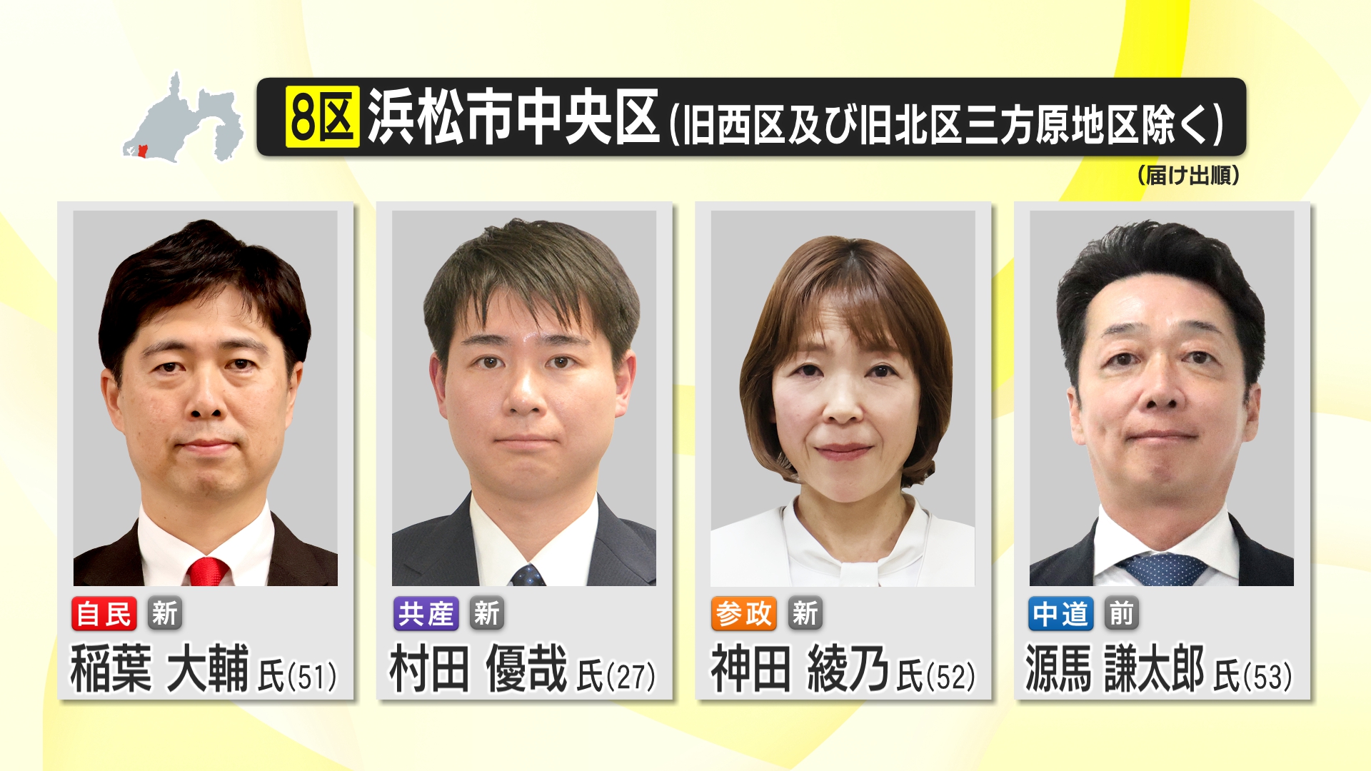 第51回衆議院解散総選挙は2月8日に投票が行われ、各地で開票作業が進んでいる。午後11時30分時点における静岡8区立候補者の得票数は下記の通り。