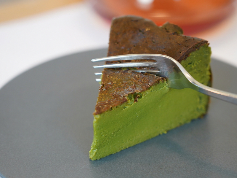 3種のチーズを使用した「抹茶バスクチーズケーキ(お茶セット 1400円)」は、外は香ばしく、中はしっとりとした食感に仕上げられています。