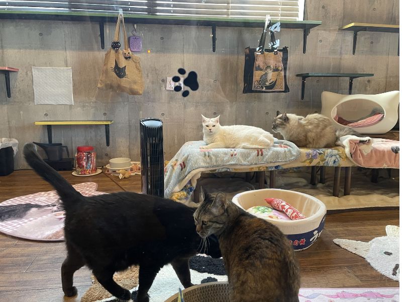 そして店内の一角には、ガラス越しにネコたちの様子を眺められる席もあります。