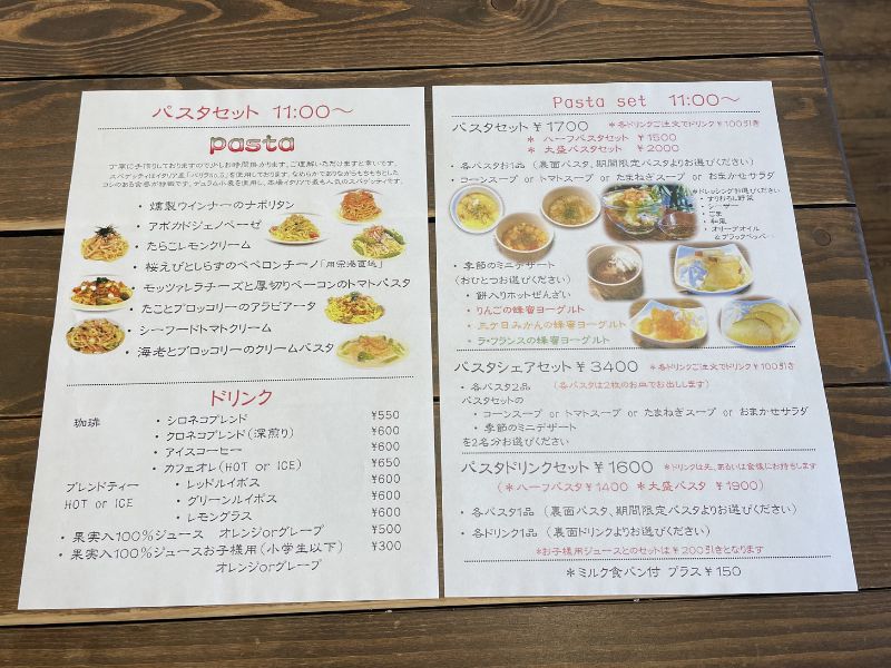 2名で2種類のパスタが楽しめる「シェアセット(3400円)」もあります。