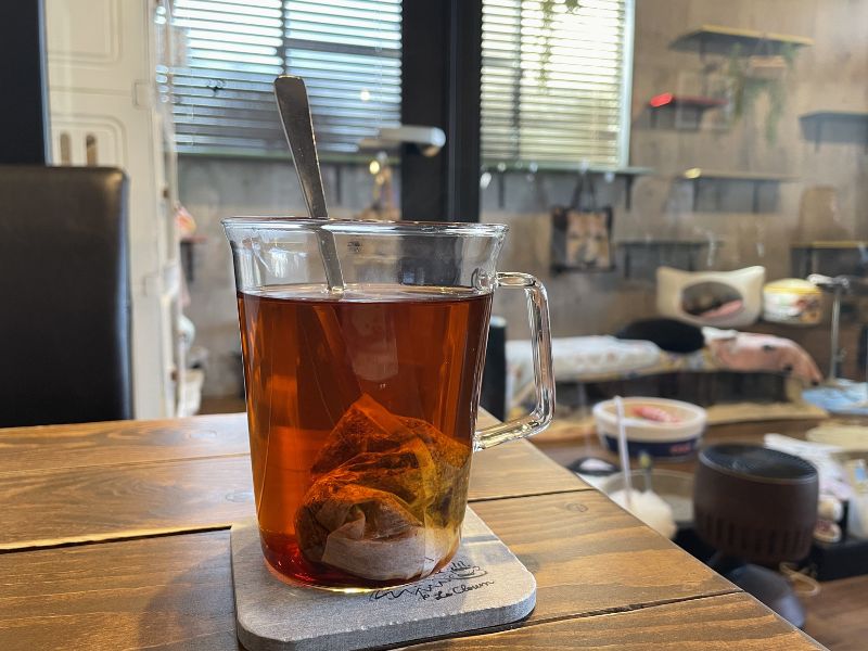 ドリンクには、レッドルイボスティーを選択。渋くなりにくい茶葉なので、ティーバッグをカップに入れたまま楽しめます。