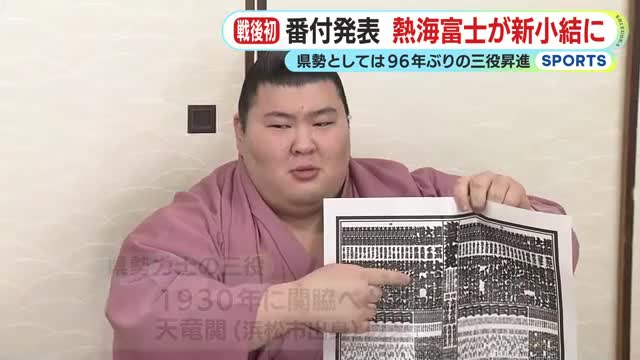 静岡県勢としては戦後初となる三役の力士が誕生します。3月8日から始まる大相撲・春場所の番付が2月24日に発表され、熱海市出身の熱海富士は西の小結への昇進が決まりました。