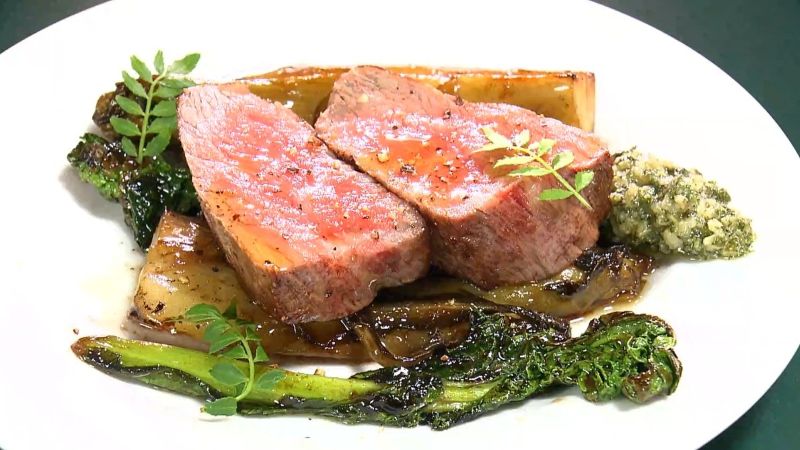 「峯野牛のロースト(100g1900円)」は浜松産のブランド和牛「峯野牛(みねのぎゅう)」を味わえる逸品。やわらかそうな赤身と、添えられた野菜の緑が目にも美しいメニューです。