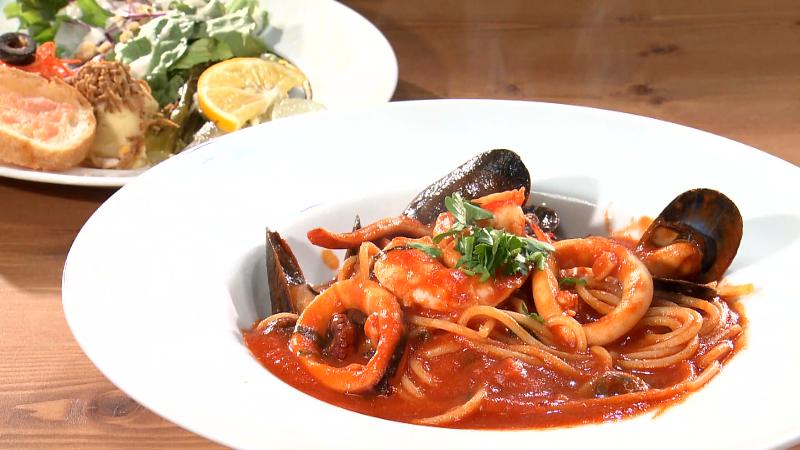 人気メニューのひとつが「ペスカトーレ(1690円)」。魚介がぜいたくに乗っていて見た目も鮮やかなパスタです。