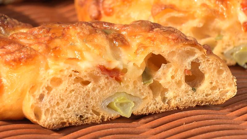 ネギとの相性もいいセミドライトマトは自家製です。パンの生地にもネギの青い部分を細かく刻んで練り込んでいます