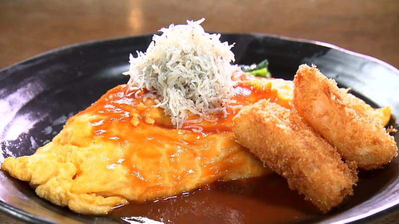 オムライスは、薄焼き卵にケチャップソースの王道スタイル。そこに舞阪産の釜揚げシラスやフライなど、地元食材をふんだんにトッピングしています。
