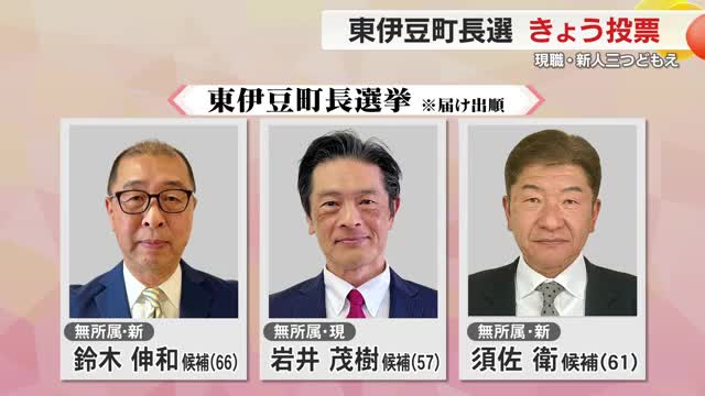東伊豆町長選挙に立候補しているのは、届け出順に新人で前町議会議員の鈴木伸和さん、現職で2期目を目指す岩井茂樹さん、新人で前町議会議員の須佐衛さんの3人です。