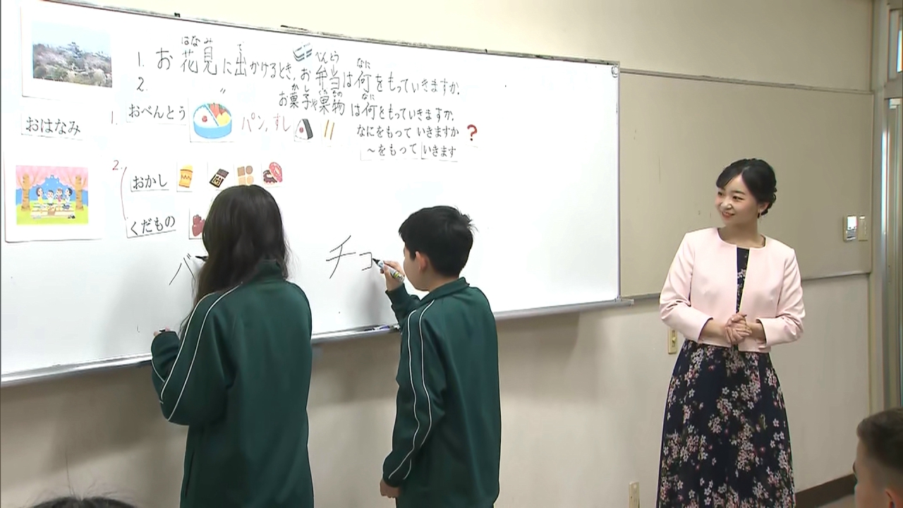 教室では、花見に出かける際に何を持って行くのか日本語で答える授業が行われていたことから、佳子さまも「お弁当に何を持って行きますか?」とたずねると、子供たちは「寿司」「おにぎり」と元気に答えていました。