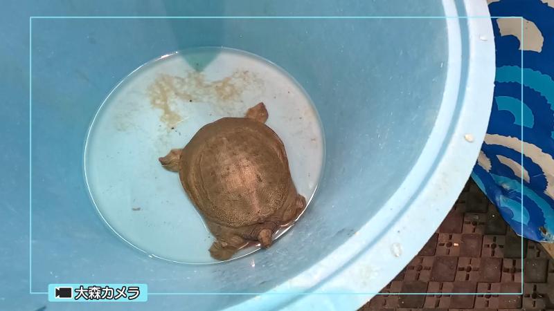 取材中に見つけたのが、青いバケツの中でどっしりとした存在感を放つスッポン。