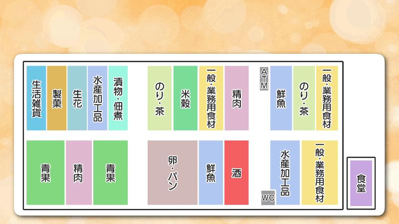 青果・精肉・鮮魚・練り物・漬物・のり・お茶など、専門店21店舗がずらりと並ぶ卸売市場です。