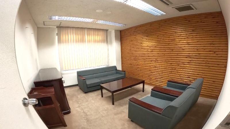 さらに金庫の隣にある部屋は、ふわふわの絨毯と重厚な応接セット一式が残る豪華な応接室。かつて支店長が商談などに使っていたとみられる部屋です。