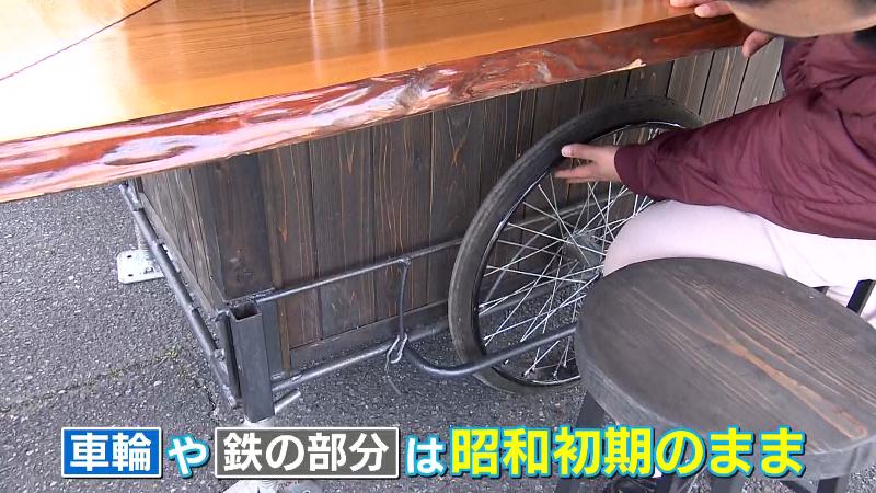 車輪や鉄の部分は昭和初期のまま。祖父が使っていたリヤカーをそのまま生かしながら、地元の空間デザインチーム「CADENS CRAFT(吉田町)」と共に約1カ月かけて作りました。