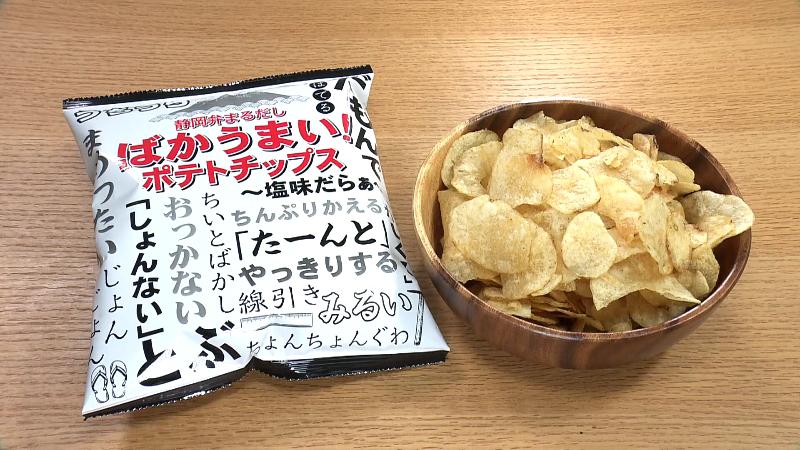 白地のパッケージに黒の筆文字で静岡弁がぎっしりと書き連ねられ、中央上部には赤字で「ばかうまい!」、その下に「ポテトチップス」の文字。