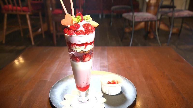 喫茶メニューの中でも特に人気が高いのがパフェです。「ねこ白ソワレ・ルージュ(1950円)」はすごい量のイチゴが盛られたパフェ。