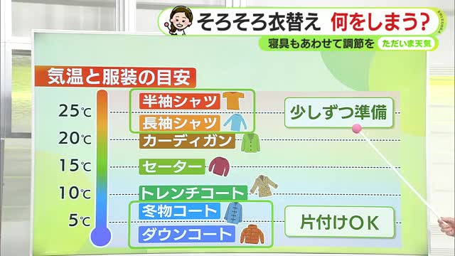 気温と服装の目安を見ると、気温1ケタではダウンや冬物コート必要ですが。この先は春物の軽いコートで良いでしょう。一方、20℃以上の日も増えてくるので長袖シャツや暑がりの方は半袖シャツも必要になってきそうです。まずは冬物を片付けて、薄いシャツやブラウスを出し始めると良いでしょう。晴れを活用しながら進めてみてはいかがでしょうか。