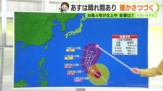 先週金曜日に発生した台風4号は大型で猛烈な勢力となっています。北上を続け、土曜日、南西諸島の東に進みます。やや東へ向きを変える傾向が見えています。本州への直接の影響はないと思われますが、波の影響はありそうです。