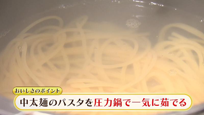 イタリア産の中太麺を圧力鍋で一気にゆでることで、麺の芯を残しつつもっちりとした食感が楽しめます。
