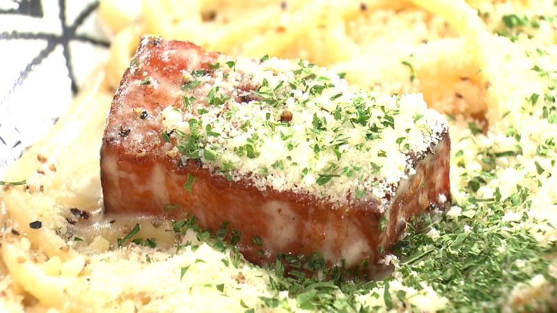 厚切りベーコンのうま味がオリーブオイルに染み込むようカリカリに焼き上げ、生クリームとからめます