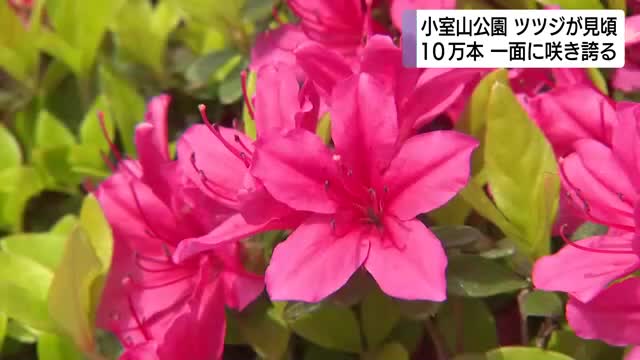 静岡県伊東市の小室山公園では赤やピンクの色鮮やかなツツジが18日見頃を迎え、観光客が春の風景を楽しみました。