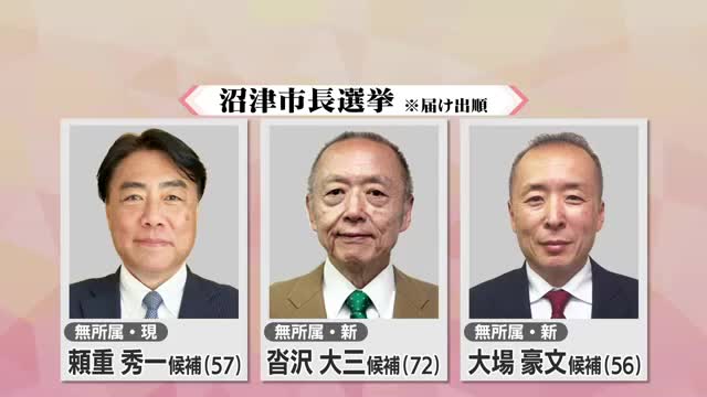 沼津市長選に立候補したのはいずれも無所属で、届け出順に現職の頼重秀一 候補、新人の沓沢大三 候補、同じく新人の大場豪文 候補です。