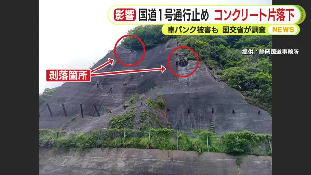静岡国道事務所によりますと、斜面のコンクリートが剥がれて落下したと見られ、職員がネットを張る応急対策を進めています。