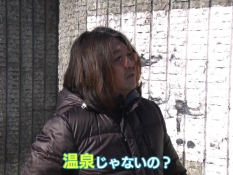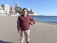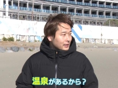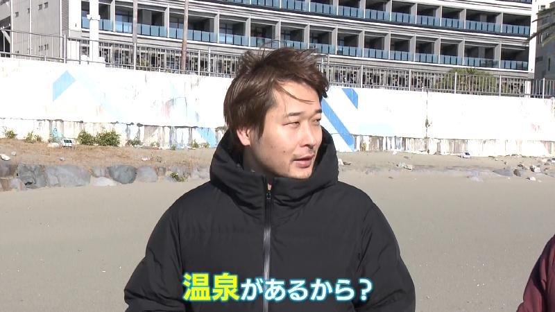 風呂桶と温度計を準備したにむらあつとリポーターが海岸に立つ