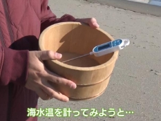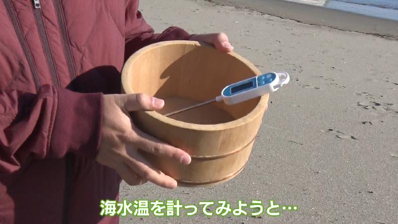 海水温を測ろうとして桶と水温計を持つにむらリポーター