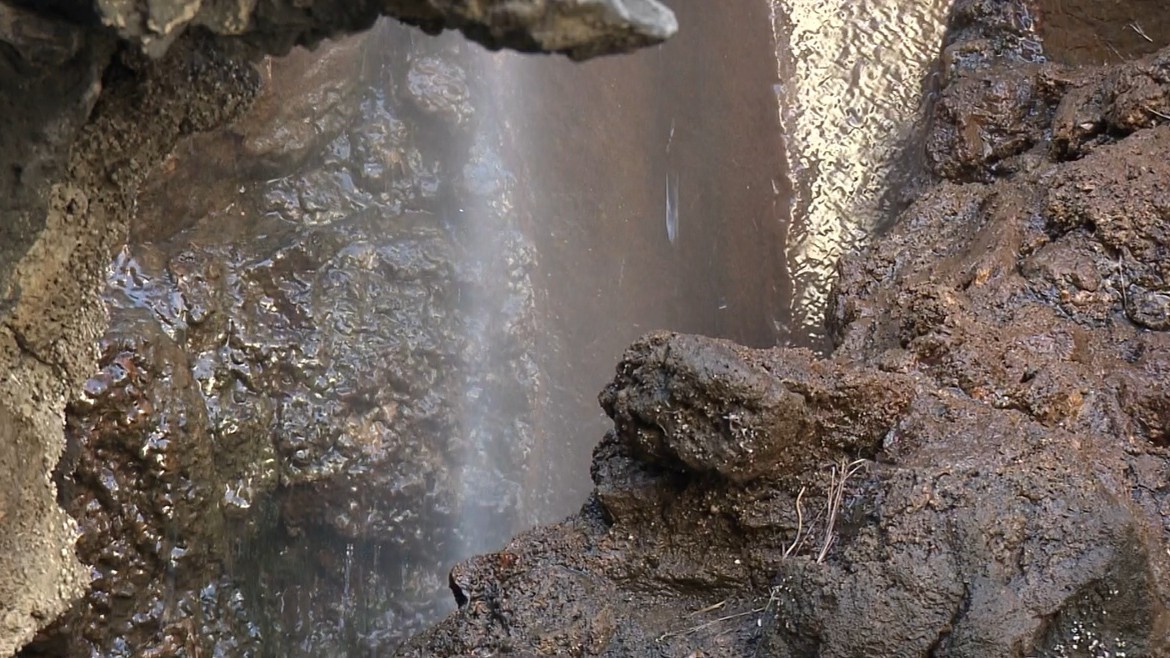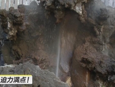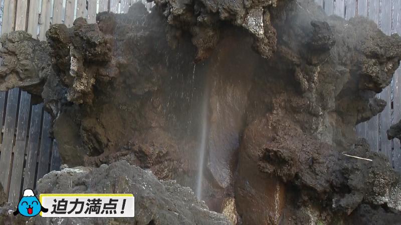 吹き出す間欠泉の噴出口と説明テロップ