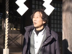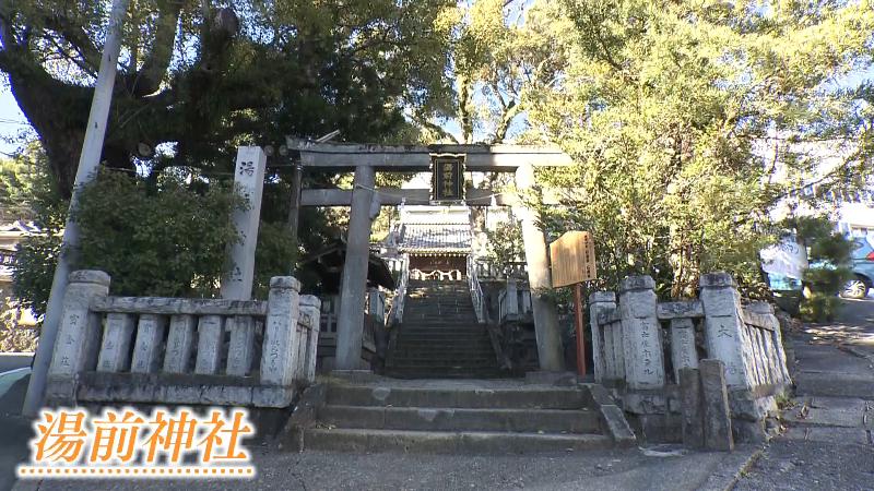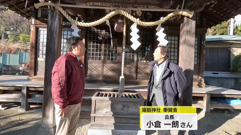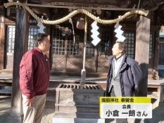 湯前神社奉賛会の小倉一朗会長とにむらリポーター