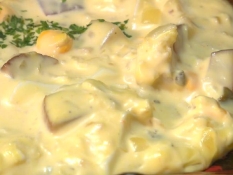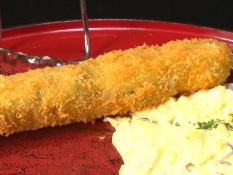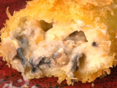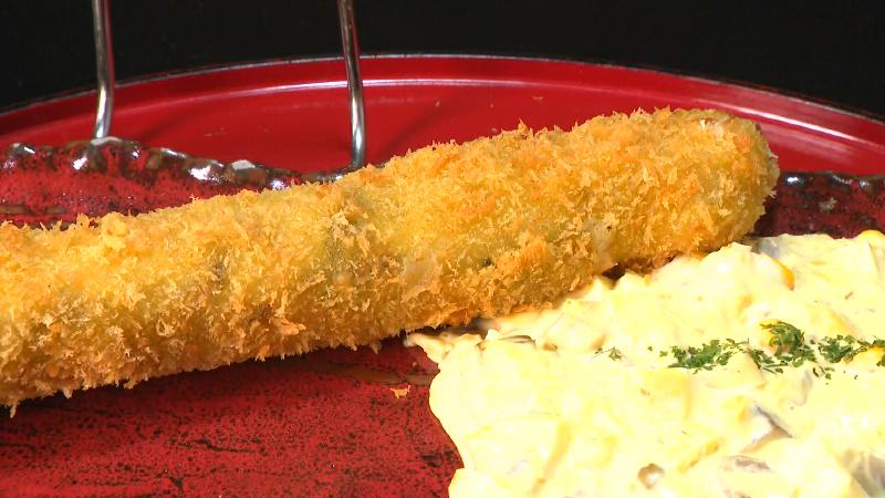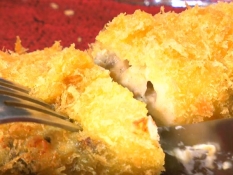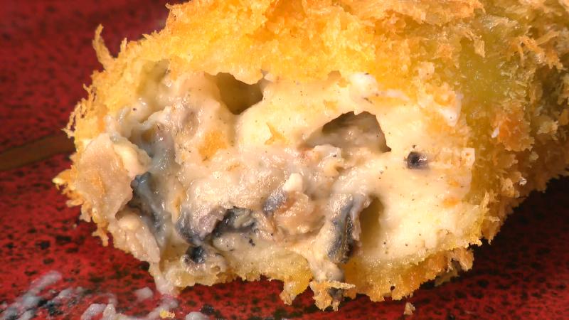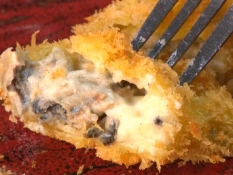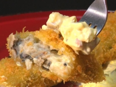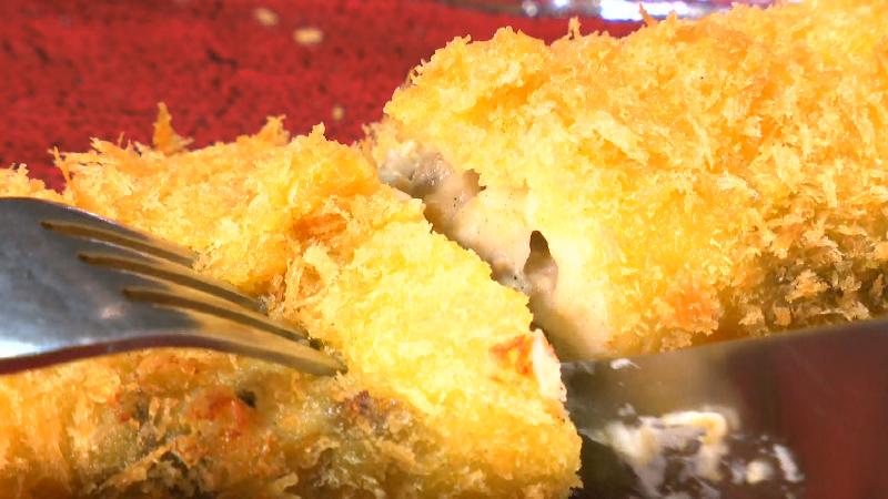 タルタルソースを付けたカキフライをフォークで持ち上げる