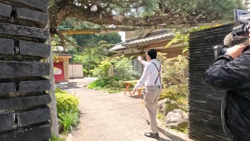 テラス席でおはぎを食べるにむらリポーターと芳川さん