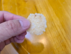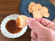 3. みしまコロッケがおせんべいに!? 新名物「三島のおせん」にソースを付けて食べてみた【三島土産】
