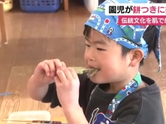 伝統文化を肌で…園児が餅つきに挑戦 深蒸し茶の粉末を練り込んだ餅に舌鼓