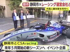 市役所前にフォーミュラカーが登場 外国人観光客を市内へ レーシング運営会社と連携
