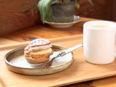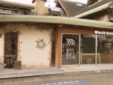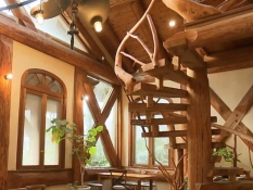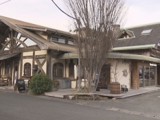 河津川沿いにあるログハウスのカフェ。コインランドリーや宿泊施設も併設する複合施設です。