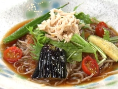 【清水区・あさ乃】 三保のブランドトマトを使った冷製そば 最後はそば湯でミネストローネ風に
